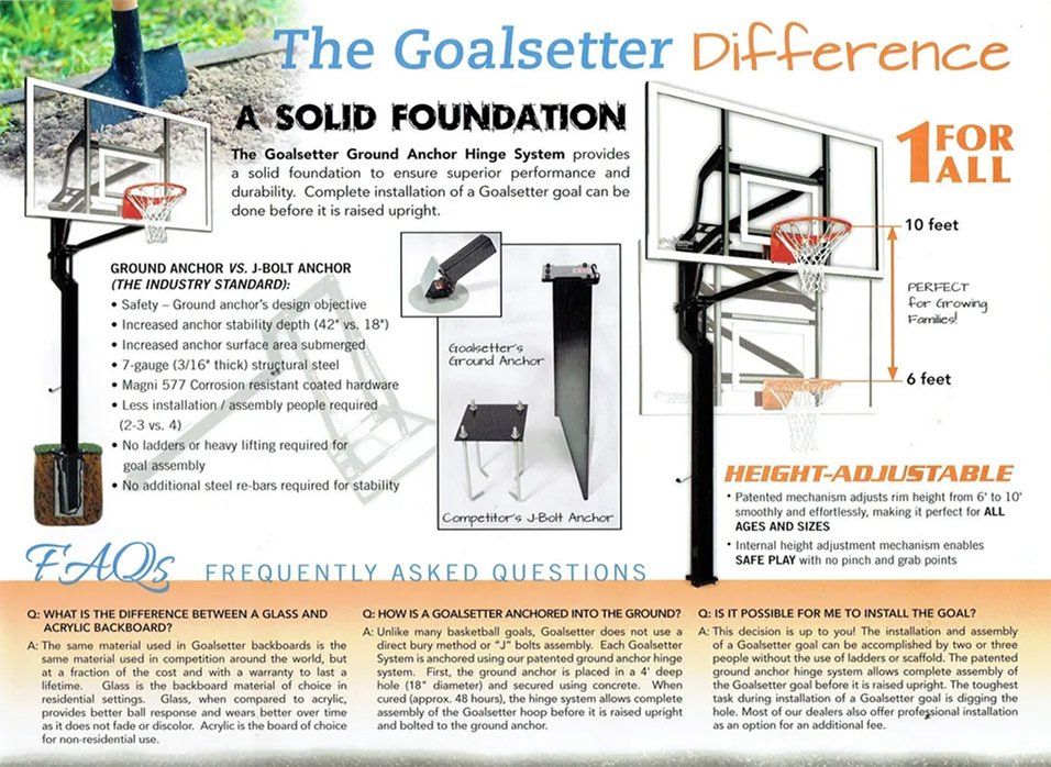Among the best selling Goalsetter basketball goals is the All-American, featuring a 60" x 38" backboard mounted on a 5" square off-set pole design that looks great outside your home and is built to endure many years of hard play. Internal compression height adjustment means there's an effortless height adjustment from 6' to 10'. Even the little ones on your team can get in the game! The All-American backboard provides a quick rebound and the rock-solid stability required by basketball players who expect the best basketball goal performance available. The 3' overhang provides plenty of room under the goal for aggressive basketball play. Delivery and Installation included. Installation includes footings installed into dirt. Footings installed into cement is additional.
