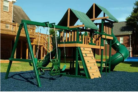 Wood mulch as a play surface is the most affordable option for ground cover. The biggest mistake that people make when selecting this product is not using enough of it. The price is cheap enough that buying extra is not wasteful, but rather an investment in the overall safety of the play system. For most residential applications we suggest 6-8 inches of wood chips. We also suggest using a geo-textile weed mat as well. This is applied on the ground before the wood chips are installed. The perimeter can be enclosed with ties of any number of materials. We sell rubber ties, as well as wood ties. Both work well. The rubber ties are soft so a trip and fall on to them is a bit safer than a fall on the wood ones. The main purpose of the ties is to keep the mulch from migrating. Some applications, in less formal areas, are often done without border ties. this eliminates the possibility of tripping upon entering or exiting the play area. This type of installation works well in wooded areas.